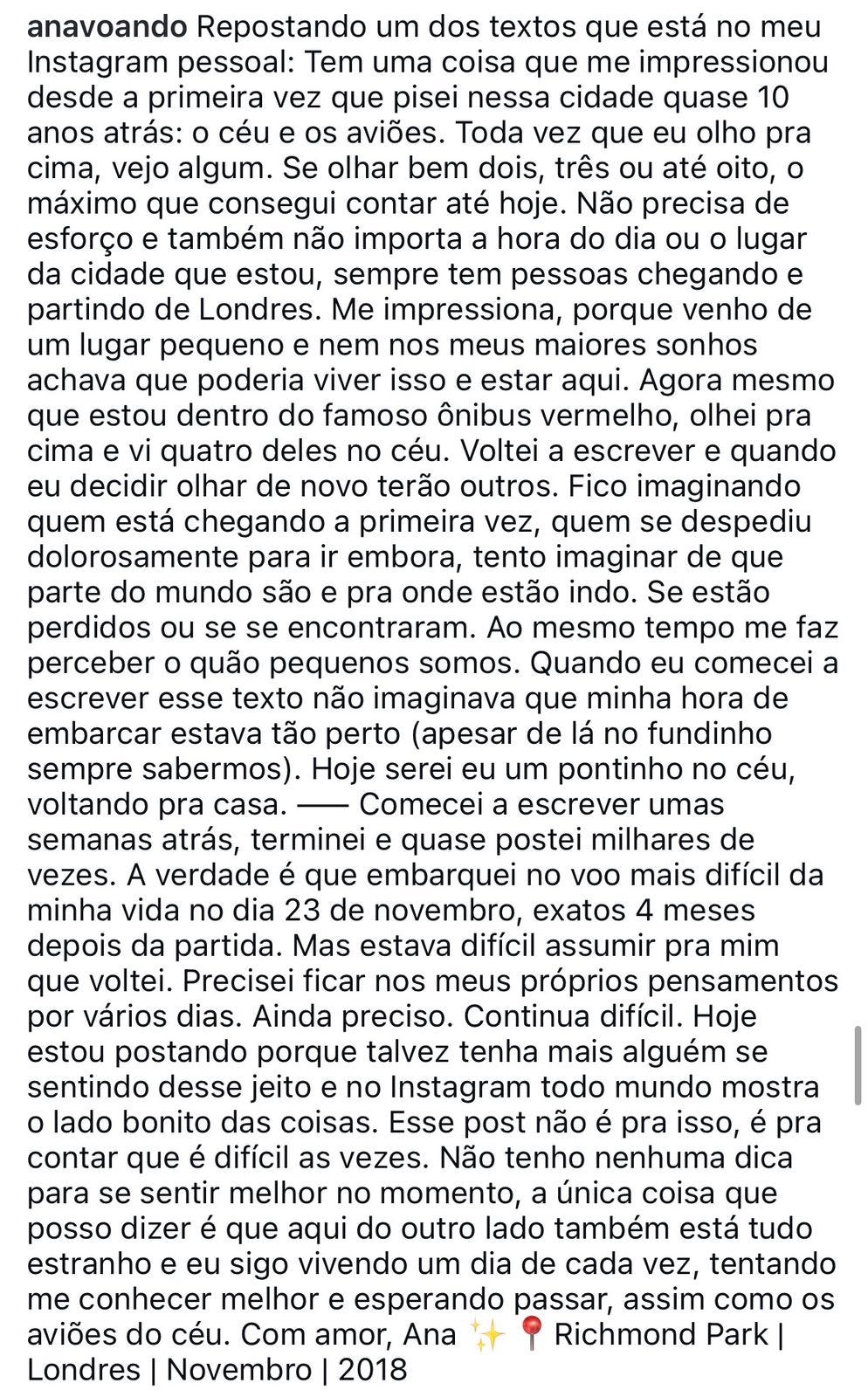 Como eu estava incomodada de postar no meu Instagram pessoal, eu resolvi tornar ele privado e criar um novo nome. Devo ter ficado uns 3 dias pensando até encontrar disponível Ana Voando que eu achava que se conectava com as viagens que eu curtia muito relatar.